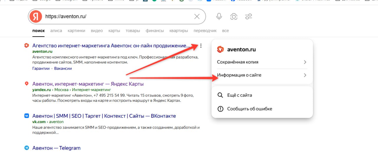 - Если нужно узнать индекс конкурента, доступ к Вебмастеру не требуется. Достаточно найти ресурс в поисковой выдаче Яндекса, открыть дополнительное меню сниппета и перейти в раздел с информацией о площадке.